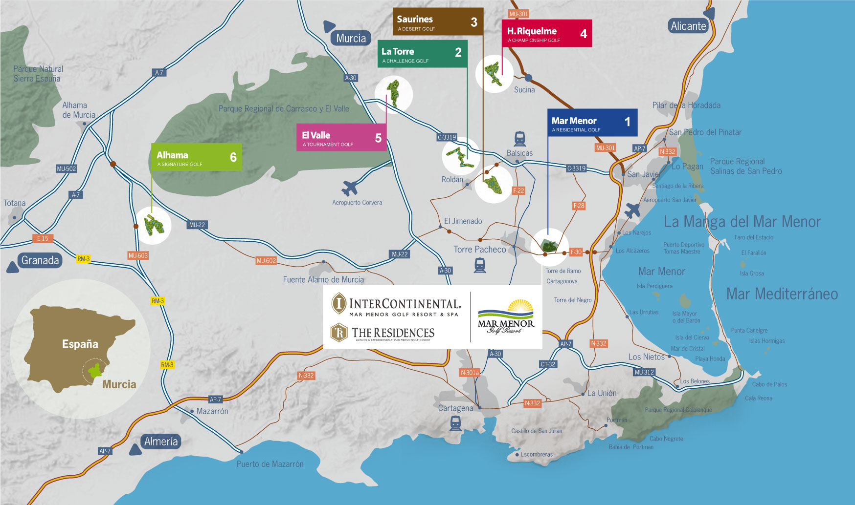 Polaris World har bygget i alt 6 golf resorts i Murcia-området. Golfbanerne er alle designet af den hidtil mest vindende golfspiller nogensinde, Jack Nicklaus. Af verdens 100 bedste golfbaner, er ca. 50 af dem designet af Jack Nicklaus.